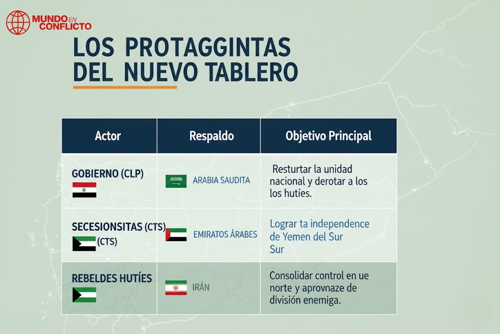 • Riad y la Unidad: Arabia Saudita sostiene al Gobierno de Yemen (Consejo de Liderazgo Presidencial) bajo la premisa de mantener el país unido. Una partición de Yemen representaría, para los saudíes, una amenaza eterna en su frontera sur y una victoria moral para los rebeldes hutíes.