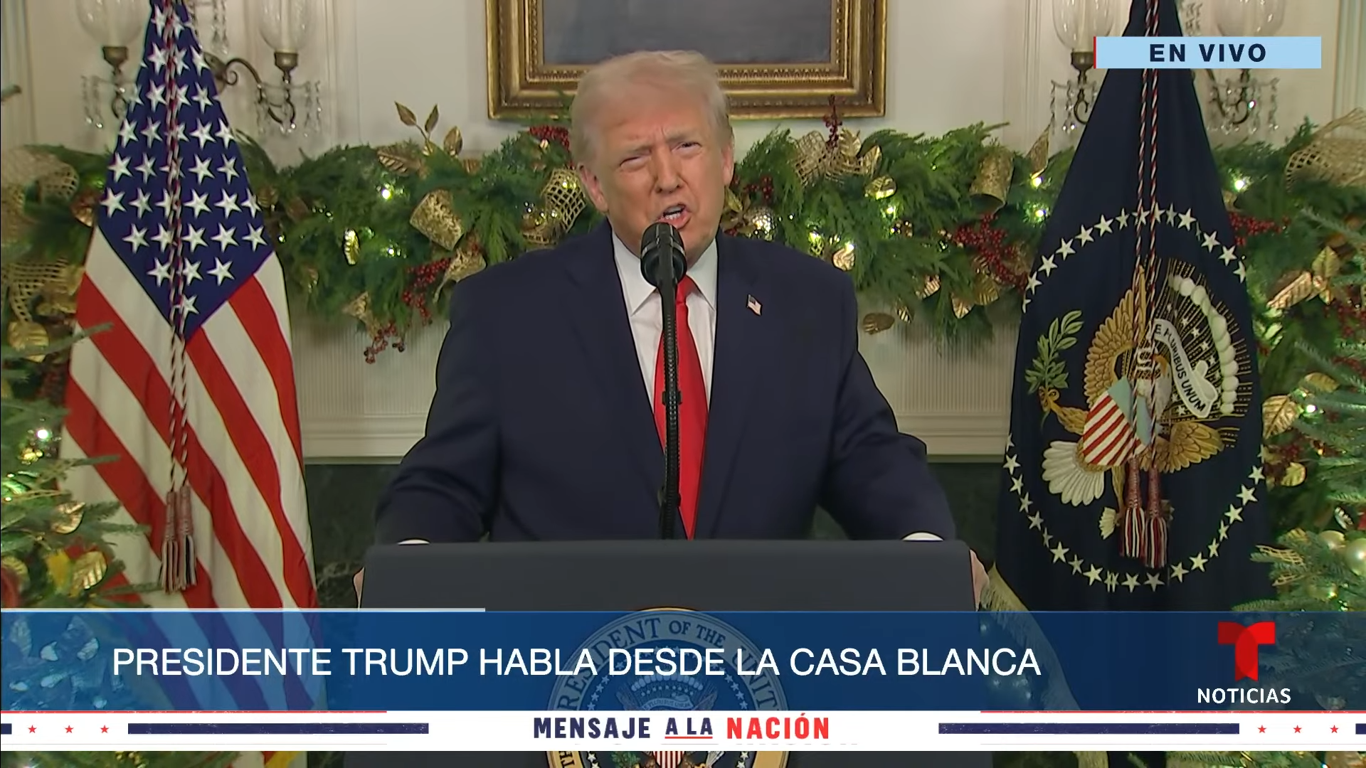 El presidente Donald Trump se dirigió a la nación este miércoles 17 de diciembre de 2025 desde la Casa Blanca. En un discurso cargado de retórica nacionalista, el mandatario defendió su gestión económica, destacó el uso de aranceles como motor industrial y anunció incentivos económicos para las fuerzas armadas, al tiempo que lanzó duras críticas contra la administración de Joe Biden, la comunidad inmigrante y las políticas de salud actuales.